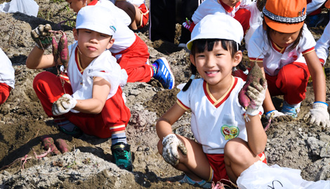 | 園の片隅のミニ畑で野菜を栽培し、育つ様子を観察したり収穫を楽しみます。